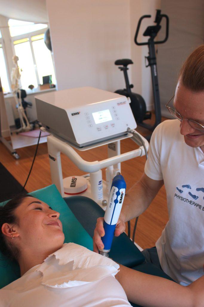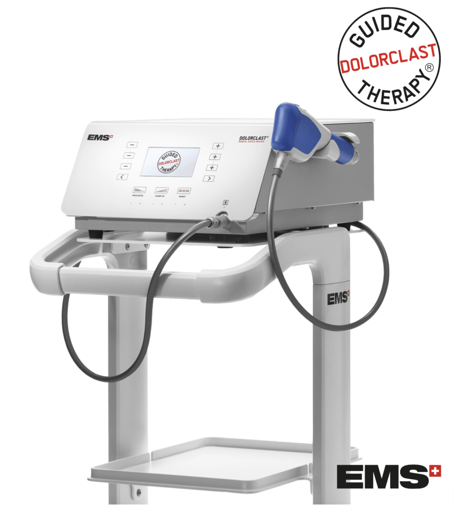 Die Therapie wird mit einem EMS Dolorclast Gerät durchgeführt. Dieses Medizinprodukt ist Marktführer, kommt aus der Schweiz und hat einige patentierte Bestandteile, welche dafür sorgen, dass viel mehr Energie in das Gewebe abgegeben werden kann.