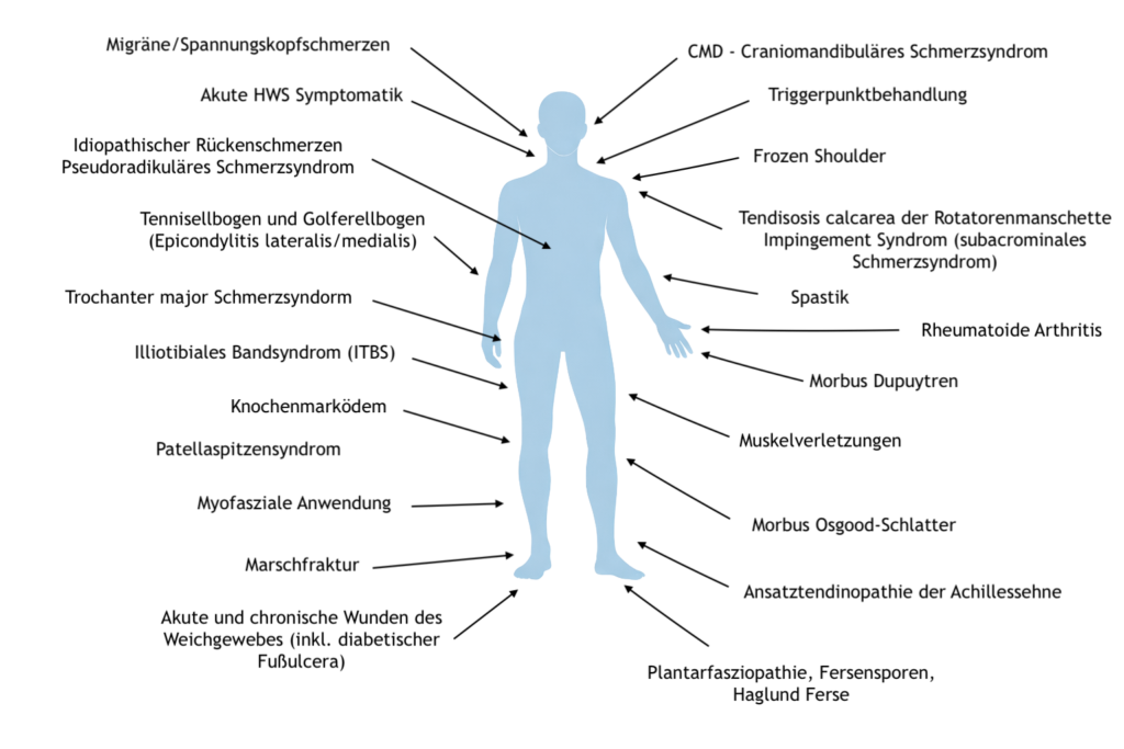 Die radiale Stoßwellentherapie ist ein nicht-invasives, physikalisches Behandlungsverfahren, bei dem hochenergetische Druckwellen über einen Applikator von außen in das Gewebe eingeleitet werden. Die Energie breitet sich radial (kreisförmig) aus und wirkt vor allem auf Muskeln, Sehnen, Faszien und deren Ansatzpunkte. Sie wird ambulant durchgeführt, ist kurzzeitig schmerzhaft, benötigt aber keine Operation und keine Medikamente.